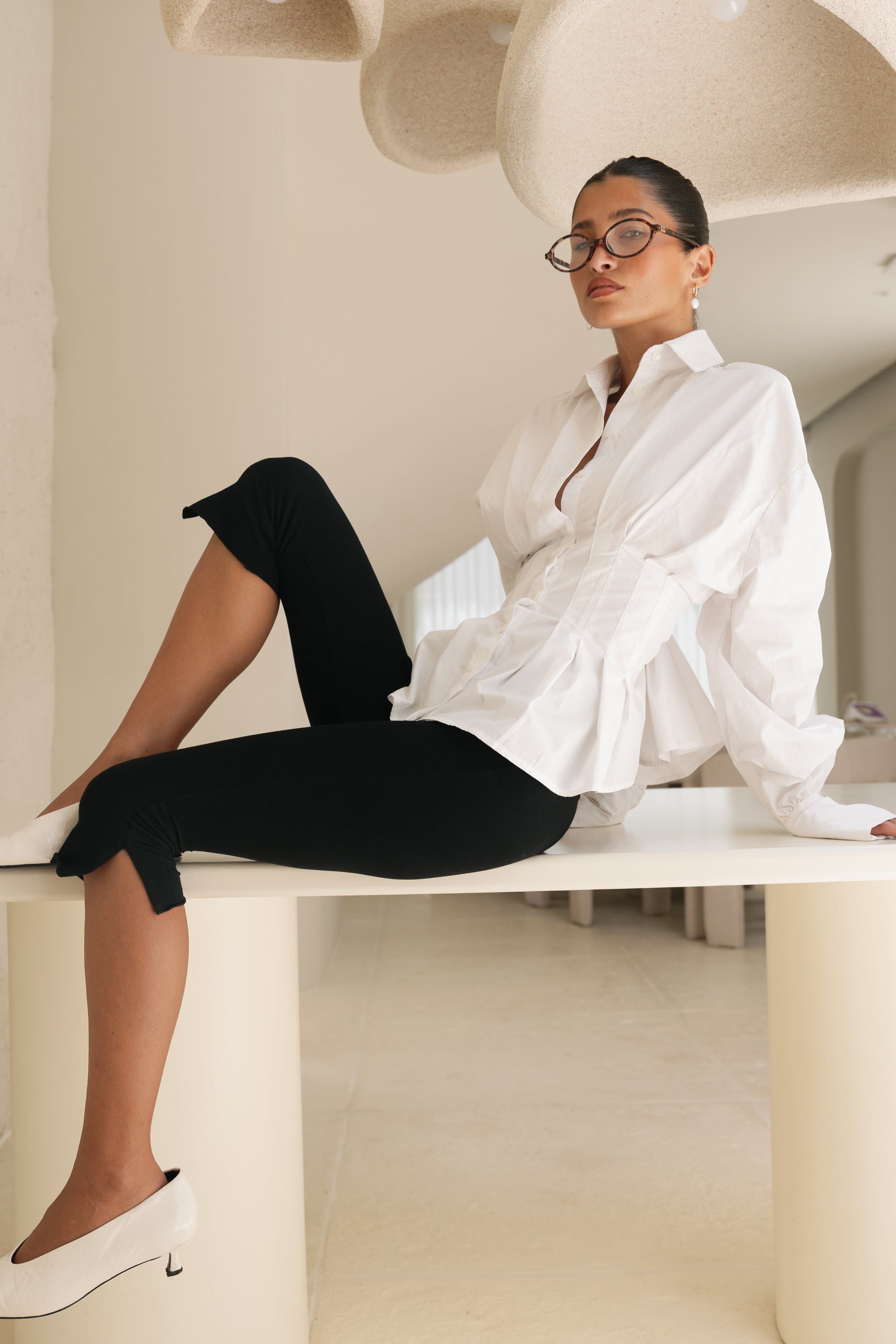 Inspired by slow mornings in sunlit workspaces, the Studio Shirt brings structure and softness together in one sculptural silhouette. Cut from crisp white poplin, it features a cinched waist that shapes naturally to the body, falling into a gentle peplum that moves with you.